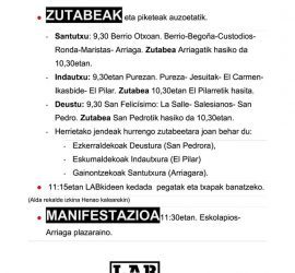 Kaixo: Hurrengo martxoaren 20an, LABek beste sindikatuekin batera mobilizazio batzuk antolatu ditu Bilbon. Atxikituta doan dokumentuan daukazue greba eguneko egitaraua. Jasotzen ari diren datuen arabera greba egunak arrakasta handia izango du Animatu eta parte hartu zutabeetan! Kaixo: El próximo 20 de marzo, LAB junto con los demás sindicatos ha organizado […]