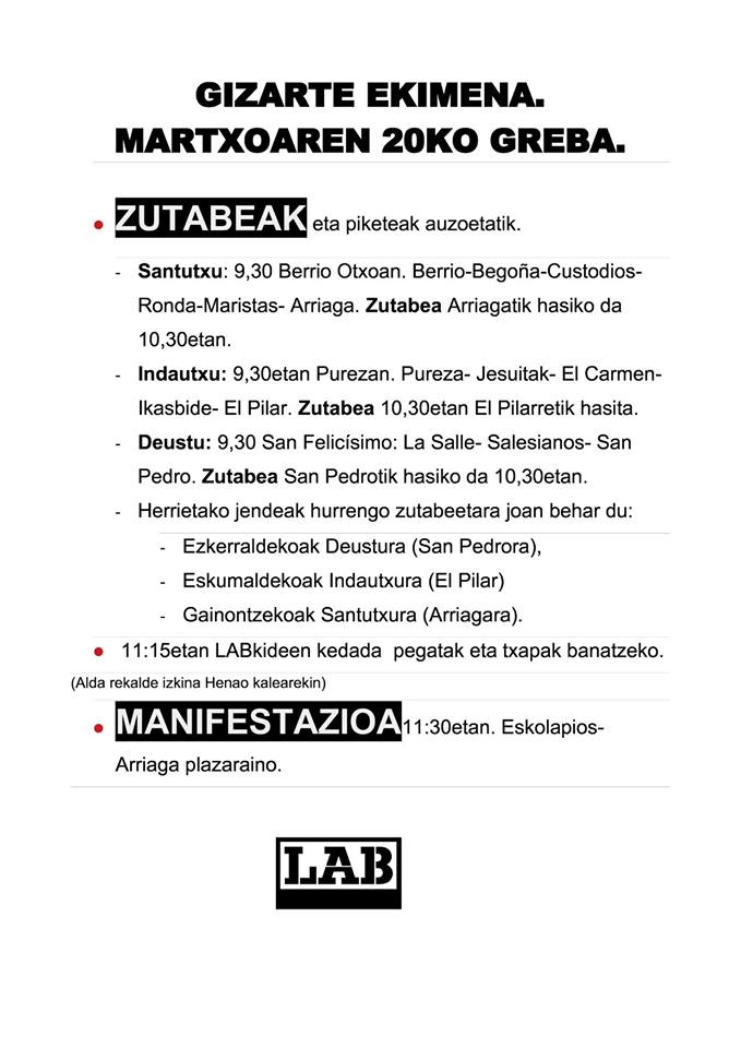 El próximo 20 de marzo, LAB junto con los demás sindicatos ha organizado movilizaciones antes de la manifestación.
