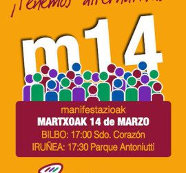 Manifestazioa: martxoak 14 Bilbo: 17:00 Sdo. Corazón Euskal Herriko eskubide sozialen karta ‪#‎m14aldaketasoziala‬ [yeblonqrcode size=»100″ url=»» class=»» style=»»]   Partekatu / Compártelo: