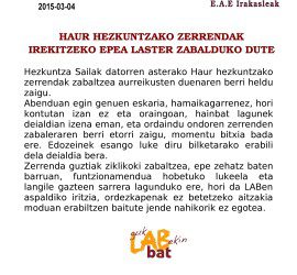 LAB sindikatuko Prebentzio delegatuei, Lanpostuetan ematen ari diren erasoen aurrean enpresari egin diogun proposamenari buruz langile guztioi informatzea gustatuko litzaiguke. Hain zuzen ere «gure lanpostuen ematen ari diren erasoen trataera». Proposatzen dugun plangintza, erasoen prebentzioari eta eraso horiei ematen zaien trataerari dagokienez helburu zehatzak ditu. Izan ere, plan hori zuen […]
